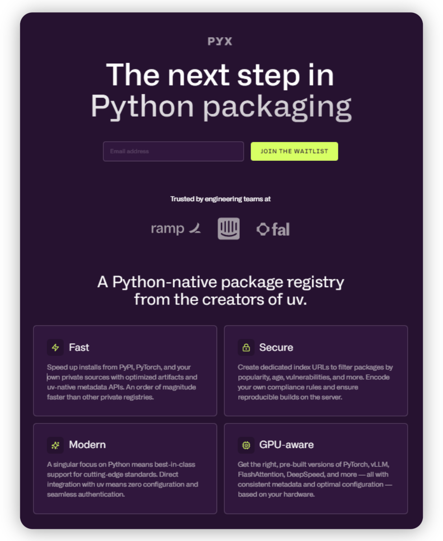Why this matters 👉 This reveals Astral's monetization strategy: give away the tools (Ruff, uv), but charge for the infra layer. Pyx combines policy-aware features (CVE monitoring, RBAC) with hardware-aware builds (GPU packages, CUDA optimization) — targeting Python teams frustrated with Cloudsmith's licensing and feature bloat.